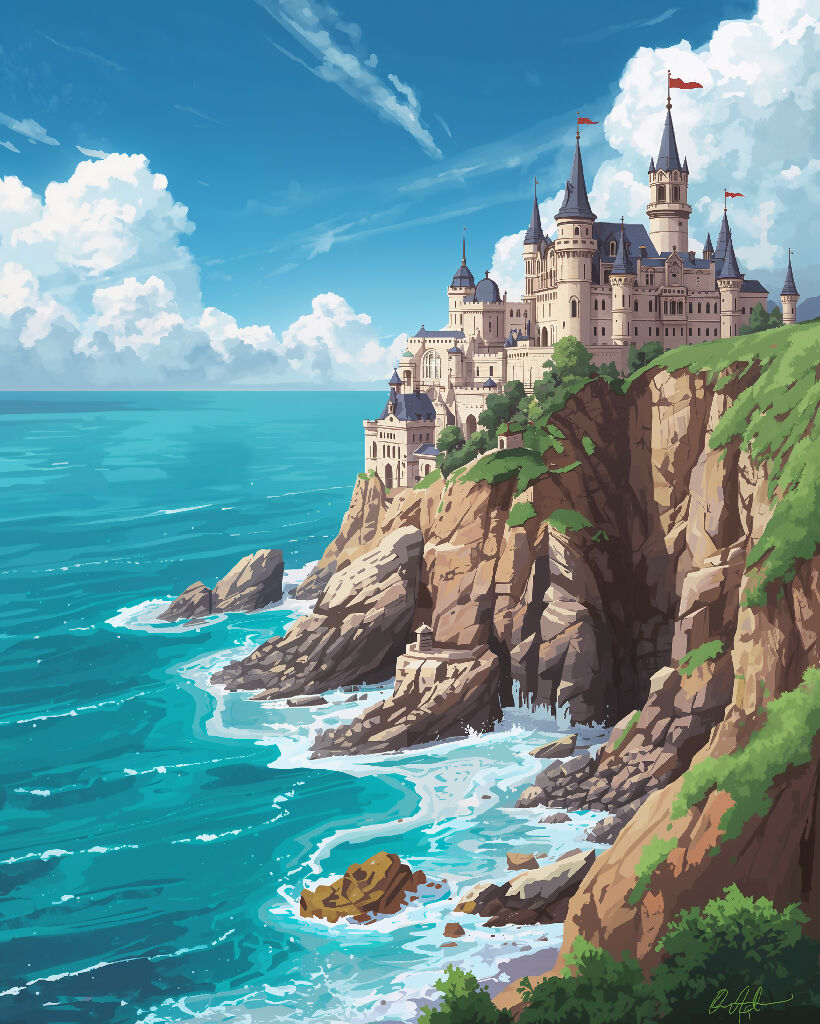 Beautiful seaside citadel with intricate architecture and majestic spires situated atop a rugged steep cliff overlooking blue turquoise water that crashes into the cliff below with foamy white waves and sea spray