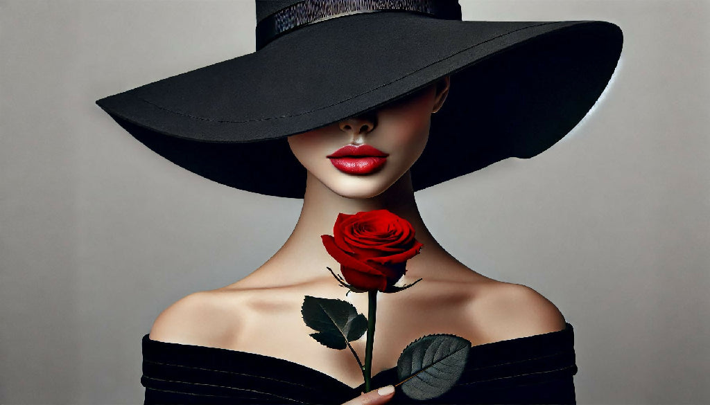A fascinating portrait of a woman wearing a large, elegant black hat. The hat has wide brims that frame her face, adding a touch of mystery and style. In her hand she holds a bright red rose, which forms a beautiful contrast to the black hat and her outfit. The rose symbolizes passion and beauty and immediately attracts attention. The woman has a gentle but confident smile on her lips, and her eyes exude a mixture of grace and strength. This depiction exudes elegance and style, capturing the essence of a confident woman who is both classic and modern. It is an image that celebrates both the beauty and individuality of the woman and captivates the viewer.