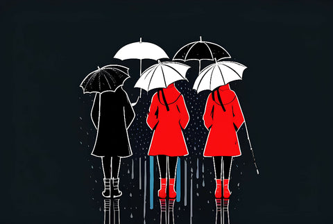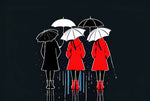 The artwork depicts a group of individuals navigating a rainy city street. The artwork celebrates the similarities, but also the unique qualities of each person.