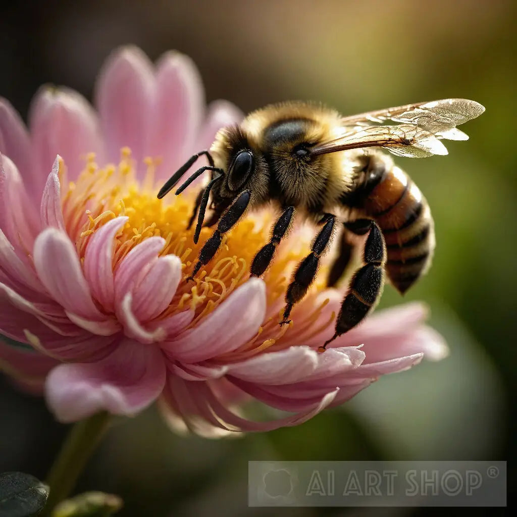 The image shows a close-up of a bee on the bright yellow center of a pink flower. The bee’s wings are translucent, and its body has the characteristic yellow and black stripes. The flower has numerous delicate pink petals radiating from the center. This image is interesting due to the detailed view it provides of the bee, which could be relevant for educational purposes related to entomology or botany.