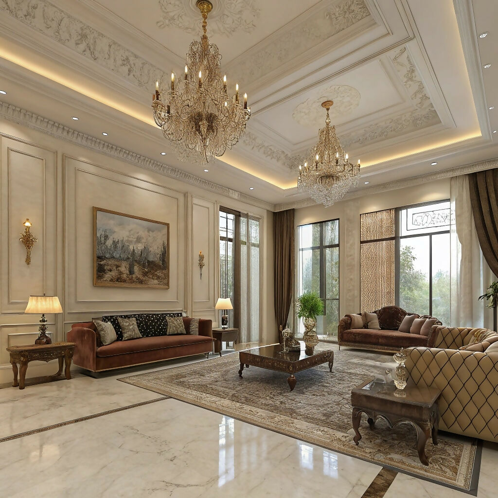 A large, light beige-cream living room boasts intricate crown moulding and paneling.  Two large crystal chandeliers hang from the high ceiling, adding a touch of opulence.