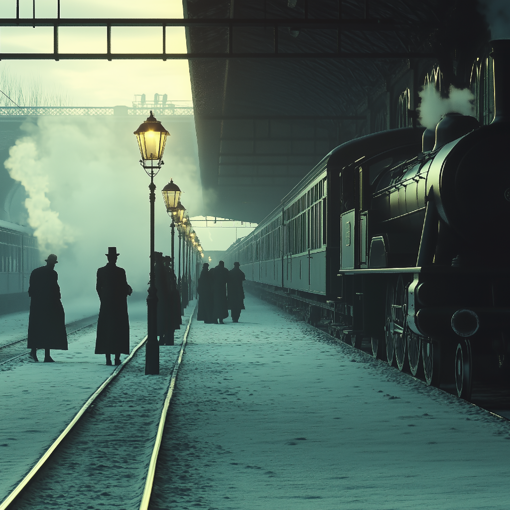 In this atmospheric AI scene, snow dusts the rails beneath a row of glowing lanterns. Figures in dark coats walk in silence as a long train waits under a grand station canopy. The smoke drifts like memory, and every footstep feels like a page in an unwritten novel.