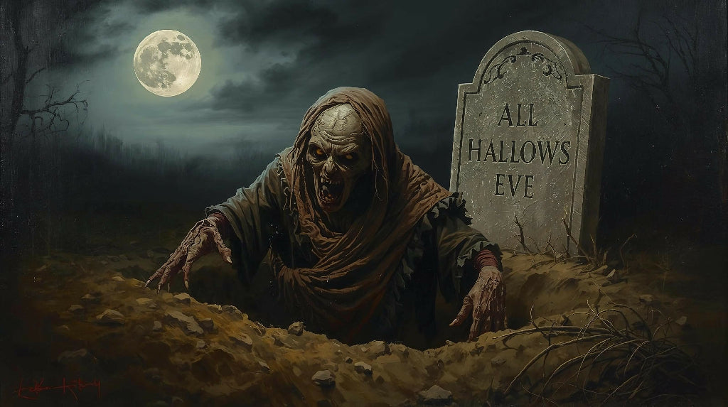 Creepy painting of a zombie rising from the grave with a full moon in the background.