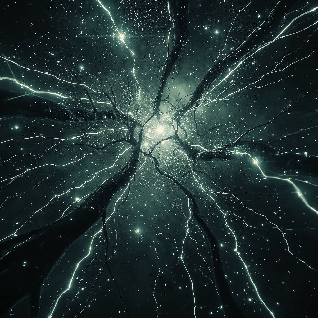 Delicate tendrils of light radiate from a central nucleus across a star-scattered void, evoking both neurological networks and cosmic formation. The ethereal branches pulse with bioluminescent energy against the deep teal darkness, suggesting the moment of synaptic awakening or stellar birth. Each filament appears to carry electrical impulses through space, creating an organic map of connection and communication. The composition bridges the microscopic and macroscopic realms, presenting consciousness as a cosmic phenomenon where thought and starlight become indistinguishable, unified in their capacity to illuminate the darkness of unknowing.