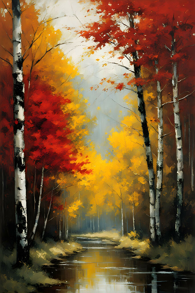 Birch Forest Layers of Color and Light Landscape. Immerse yourself in the vibrant colors of spring with this beautiful landscape painting. The birch trees and grasslands are depicted with intricate detail and volumetric lighting.
