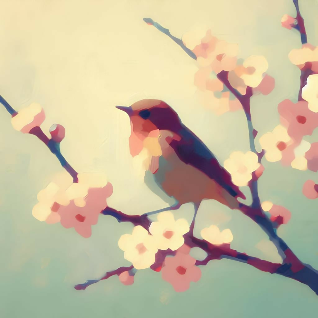 A charming impressionist AI artwork of a small bird perched on a delicate branch, bathed in soft light and vivid brushstrokes, capturing the peaceful beauty of nature in a dreamlike scene.