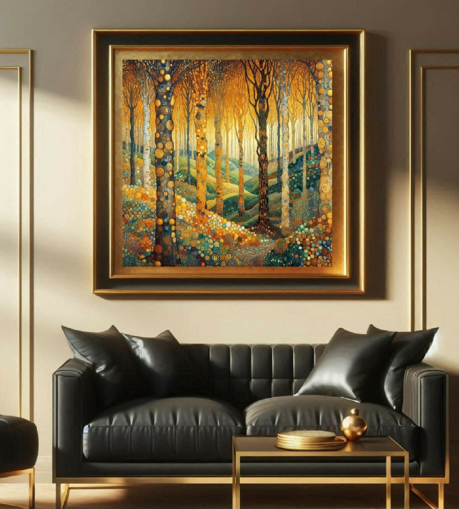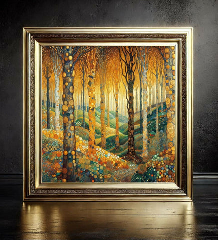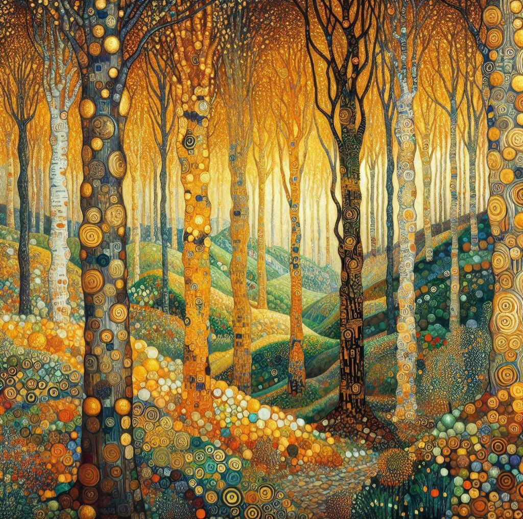 Ein sonnendurchfluteter Birkenwald in hügliger Landschaft in warmen Gold- und Grüntönen. Das Bild ist im Gustav Klimt-Stil gestaltet, mit komplizierten Mustern aus Kreisen und Spiralen. Das Bild wirkt verträumt und künstlerisch.