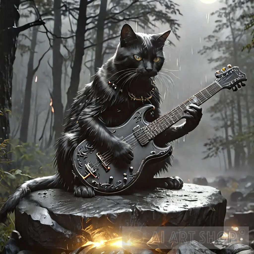 Black cat that is playing on the black guitar