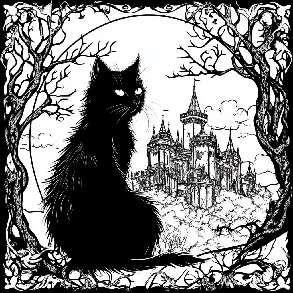 This evocative creation features a sleek black cat sitting in the foreground, its luminous eyes fixed intently on a distant, shadowy house. The stark contrast of deep blacks and crisp whites highlights the eerie details of the scene—the house stands silhouetted against a pale, cloudy sky, with an air of quiet mystery. The cat’s poised, watchful stance adds a sense of intrigue and tension, making the viewer wonder about the secrets the house might hold. Perfect for lovers of minimalist yet moody art, this piece combines simplicity with a haunting atmosphere.