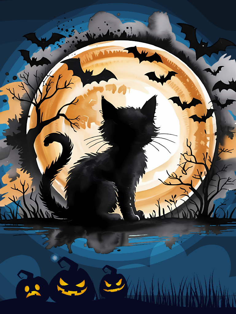 Step into a world of spooky enchantment with this stunning digital art print, "Black Cat Halloween Night." Featuring a majestic black cat silhouetted against a brilliant, full moon, this piece captures the classic magic of Halloween. The background is a haunting blend of ghostly trees, flying bats, and a starry, stormy sky, all reflecting in the water below. Three glowing jack-o'-lanterns complete the scene, adding a perfect touch of festive charm.