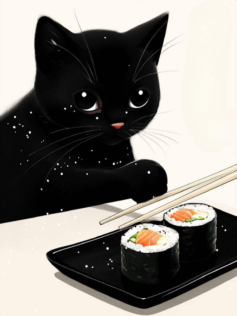 Whether you're looking for a unique gift for a friend, a new piece of kawaii art to add to your collection, or a stylish way to show off your love for both cats and Japanese cuisine, this black cat and sushi design is an ideal choice. Download it instantly to create a custom poster, print for your kitchen, or use for your personal projects.