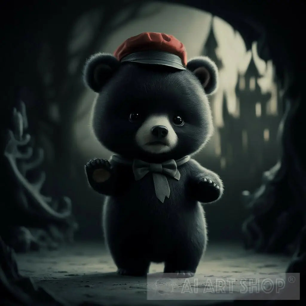a black Cute bear with a red hat, Standing on Its hind legs, a cap on Its head, a bow on its neck, in comie styls, minimalism, dark fantasy