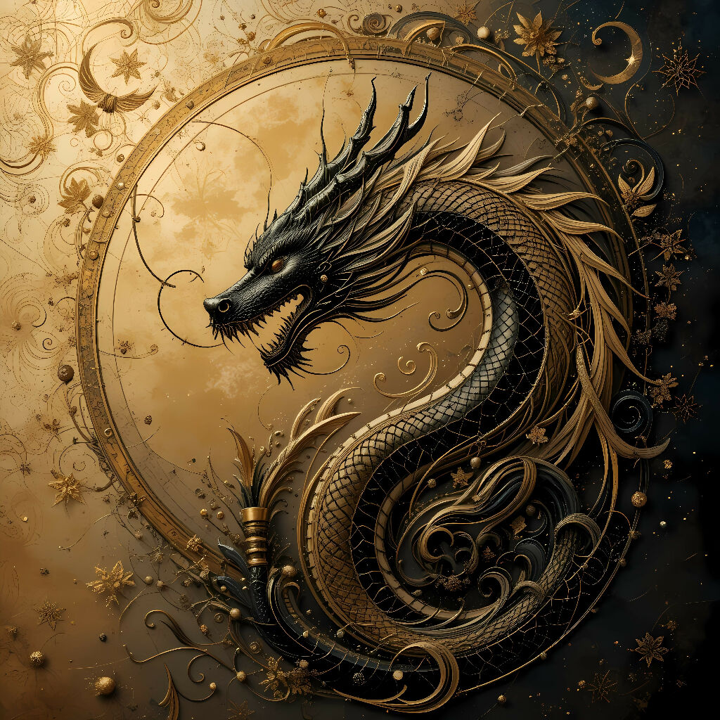 An elegant ikigai style with lite gold , black bold, and bronze colors texture themes " black dragon moon light shadow "