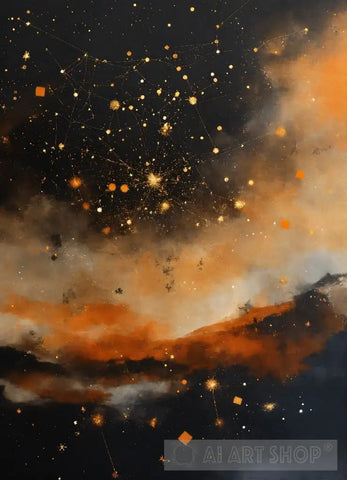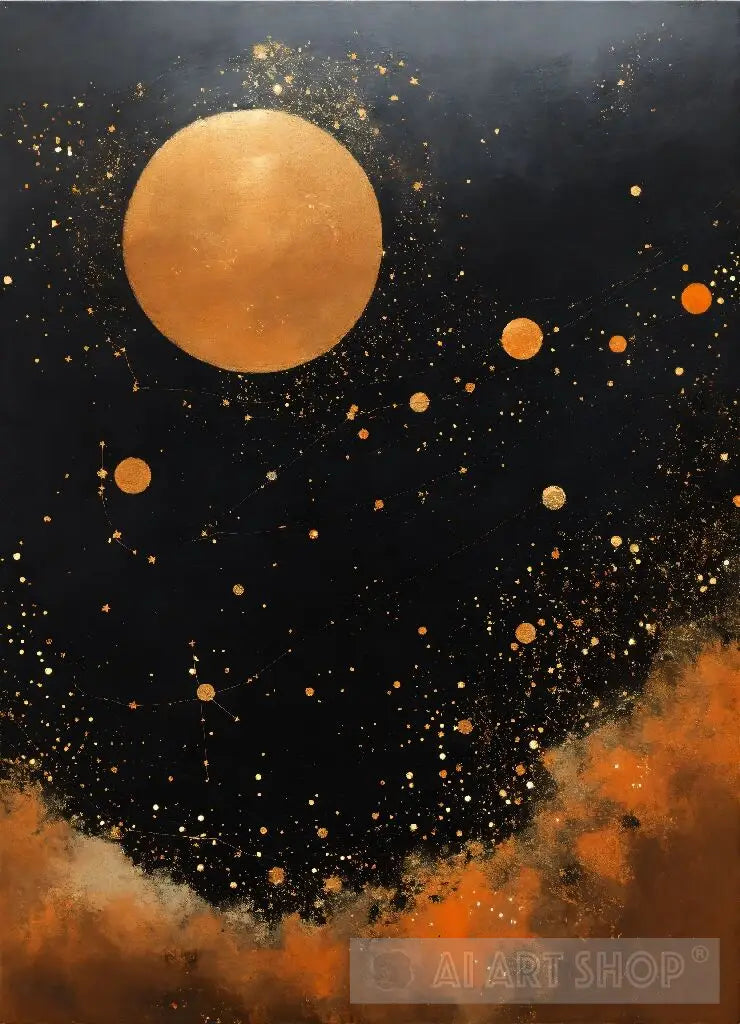 minimalist, elegant, discreet, abstract, enigmatic, sophisticated, modern, mysterious and perfect painting of constellations in sky in black gold orange and copper