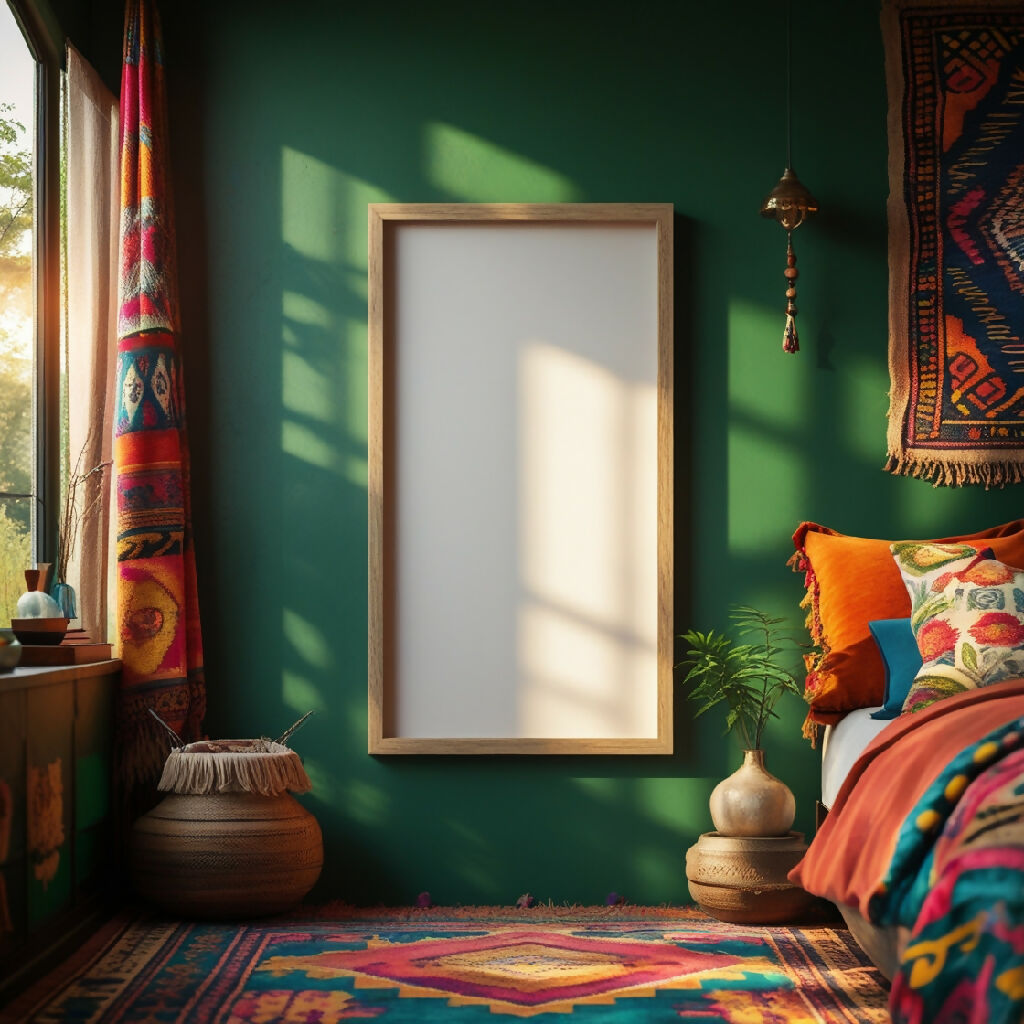 Blank vertical wall art frame mockup on a deep emerald green wall in an eclectic boho bedroom with a vibrant patterned rug, illuminated by rich warm afternoon light streaming through the window, casting a subtle glow on the surrounding decor, the wall art frame is empty with no 3D render or image displayed, the room's eclectic style is reflected in the mix of textures and colors, with the emerald green wall providing a bold backdrop for the empty frame, awaiting the addition of a unique piece of art to complete the bohemian aesthetic.