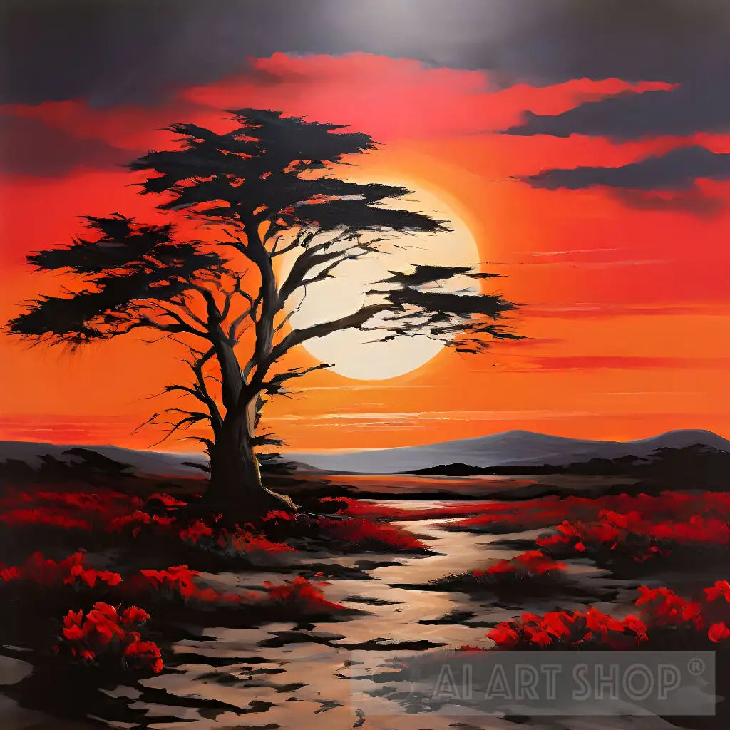 Blaze of Glory is a captivating painting that showcases a solitary tree standing tall against a fiery sunset. The vibrant colors of the sky, awash in shades of orange, red, and purple, create a dramatic backdrop for the silhouette of the tree. The black branches of the tree reach skyward, creating a sense of awe and majesty. This breathtaking piece of art is sure to add a touch of drama and conversation to any room.