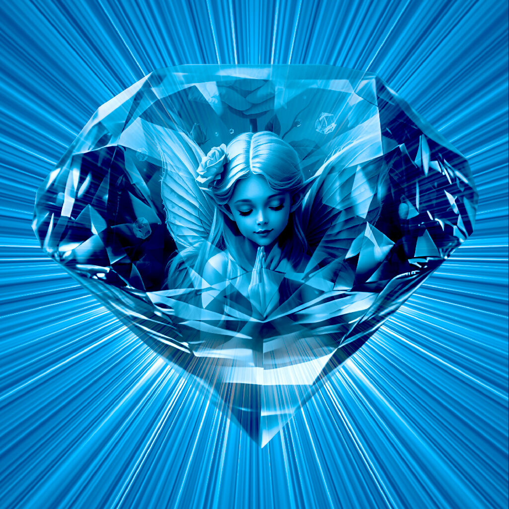 Blonde elf girl in a blue diamond - she prays and radiates peace - in a flawless cut diamond -