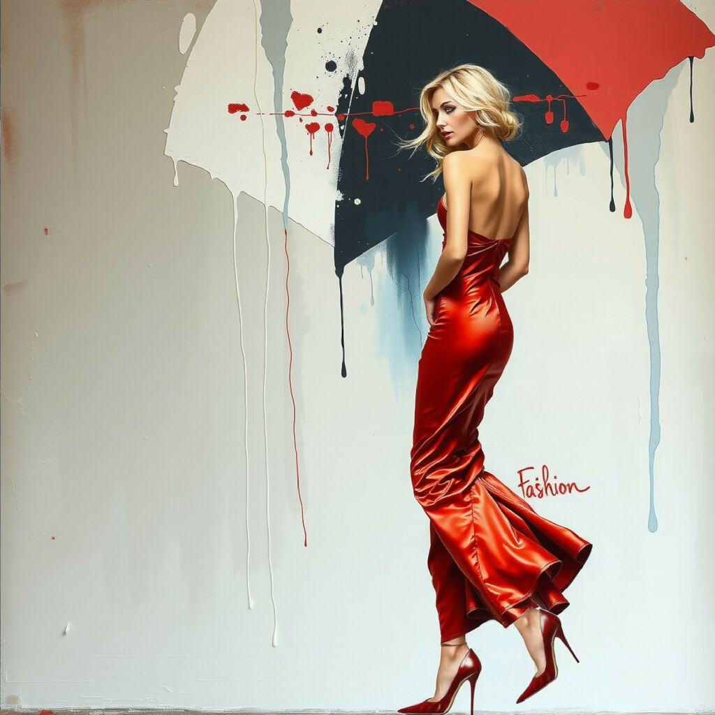 Fashion and glamour – a blonde model in a red satin dress and high heels – a mural – reminiscent of street art.