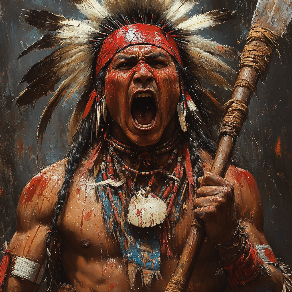 "Blood and Honor" captures the raw intensity and spirit of a fierce warrior in the heat of battle. With vivid red war paint streaked across his face and body, and a headdress adorned with striking feathers, he roars with unbridled power and emotion. His muscular frame and intricate beadwork showcase his strength and cultural pride, while his weapon, gripped tightly, symbolizes resilience and courage. The bold textures and dramatic lighting emphasize the primal energy and timeless determination of this powerful figure.