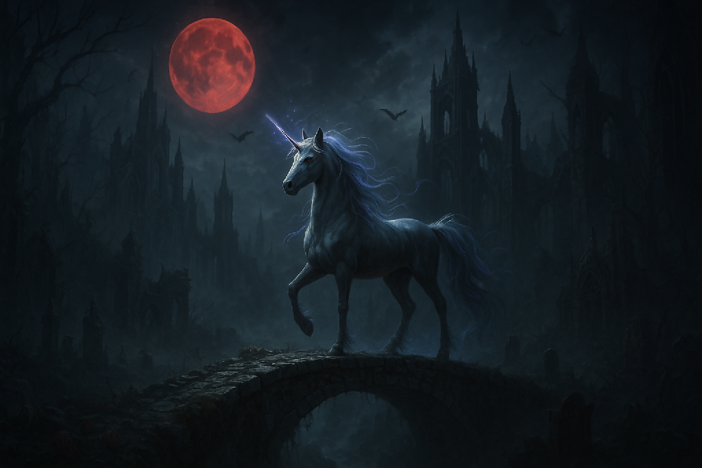 Step into a gothic realm with this breathtaking artwork of a mystical unicorn illuminated by the eerie glow of a blood-red moon. The scene is set against crumbling gothic ruins, with bats circling under a starless sky. Perfect for fans of dark fantasy, gothic décor, and mythical creatures, this piece brings an aura of enchantment and mystery to any room.