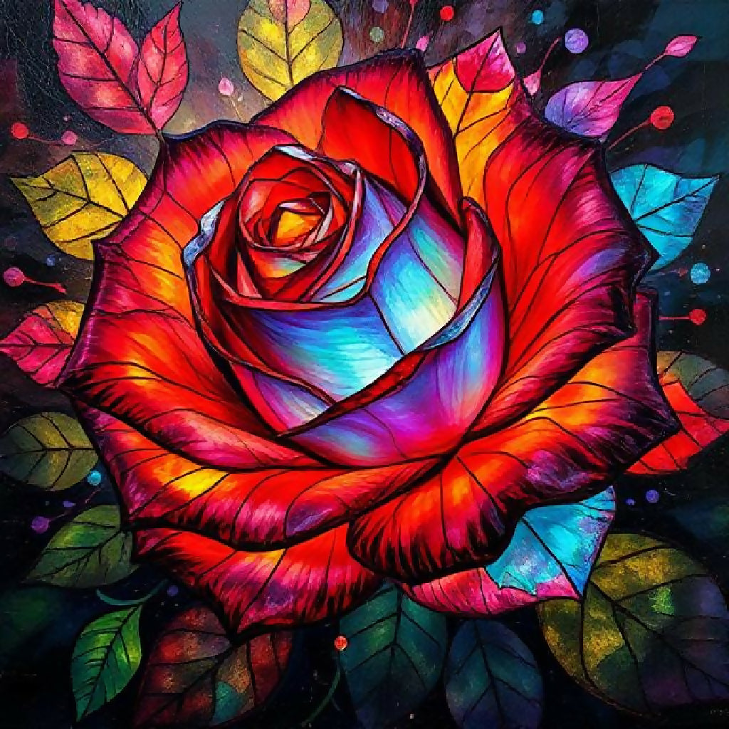 "A surreal floral painting where a single rose explodes into shards of stained glass petals, each piece glowing with vibrant colors symbolizing love, pain, and rebirth."