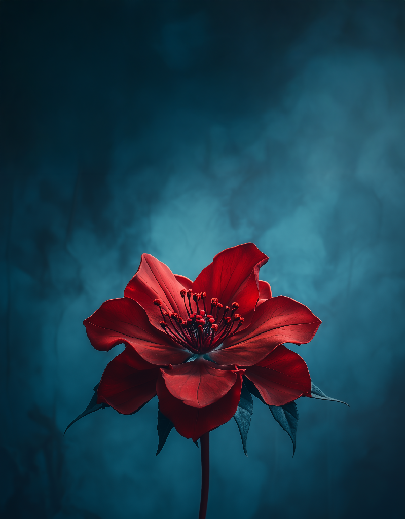 Emerging from the depths of a moody, teal haze, the vivid crimson flower stands as a bold emblem of life and vitality. Each petal unfolds like a delicate, fiery flame, its soft curves contrasting with the sharp precision of its central stamen. The interplay of light and shadow accentuates its intricate details, giving it an almost otherworldly presence. Surrounded by the ethereal backdrop, the flower appears both fragile and defiant, a symbol of beauty thriving against a mysterious and infinite void. It is an elegant celebration of nature's artistry and resilience.