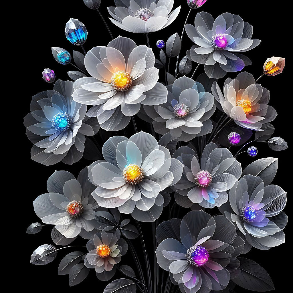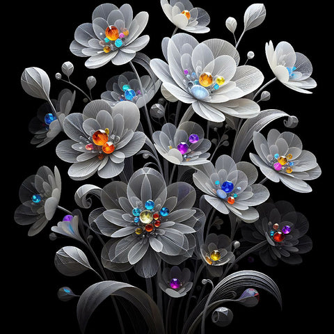 A bouquet of translucent, stylized flowers against a black background.  The flowers are predominantly white with a gray/silverish outline, giving them a semi-transparent, almost glowing effect.  Vibrant, colorful, small, gem-like accents are embedded within the flower centers and petals, with hues of orange, yellow, purple, pink, blue, and green.  The flowers have delicate, detailed, leaf-like structures and stems.  The composition is vertically oriented, with the flowers and stems filling a significant portion of the frame, positioned primarily in the center and extending toward the top and bottom. The flowers are not in perfect symmetry, but they are evenly spaced and distributed.  The overall style is abstract and decorative, with a modern, artistic flair.  The lighting is vibrant and creates a sense of luminosity from within the flowers, with colorful highlights on the accents.  Small, star-like, colorful elements are scattered across the black background, adding to the dynamic composition. The perspective is slightly looking down at the bouquet. The atmosphere is visually interesting, lively, and striking, full of energy.