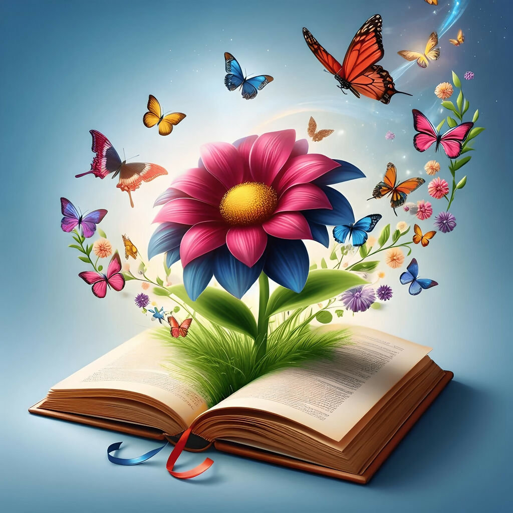 This AI-generated artwork celebrates the power of storytelling and creativity. A radiant flower with pink and purple petals bursts from the pages of an open book, surrounded by fluttering butterflies and smaller blossoms. Set against a dreamy blue gradient, the scene evokes wonder, inspiration, and the limitless beauty that blooms from knowledge and imagination.