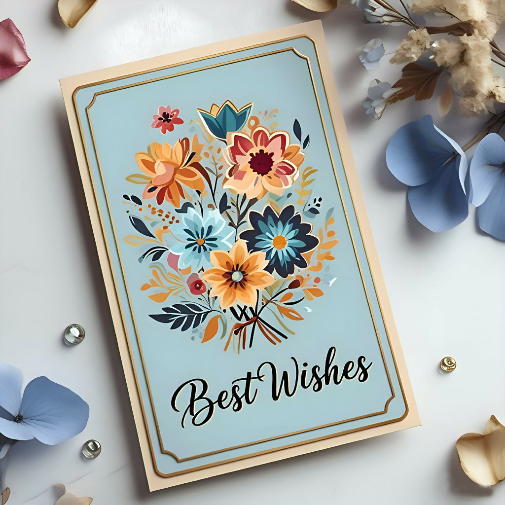Elevate your well-wishes with the "Blooming Elegance - Best Wishes Card," a masterpiece of vibrant floral artistry. This beautifully designed AI-generated card features a harmonious bouquet of orange, blue, and red flowers arranged against a serene light blue background. Enclosed within a graceful gold border and adorned with the heartfelt message "Best Wishes" in elegant script, it exudes charm and sophistication. Ideal for any occasion—be it birthdays, anniversaries, or simply letting someone know you care—this card captures the essence of thoughtfulness and artistic beauty.