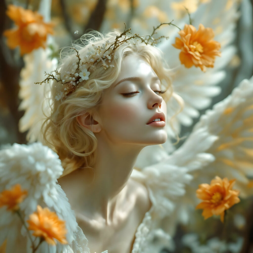 A soft breath of peace in the chaos of the world—this angelic portrait captures a moment of complete stillness and grace. With her delicate crown of twigs and blossoms, her platinum hair gently tousled, and her ivory wings glowing in golden morning light, she seems born of nature itself. Floating among blooming orange flowers, she evokes serenity, renewal, and divine beauty. A perfect piece for those who seek harmony in art.