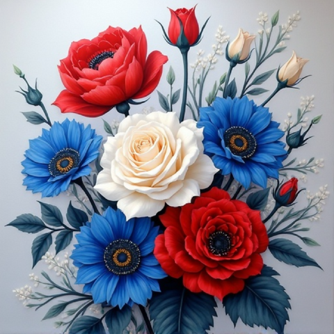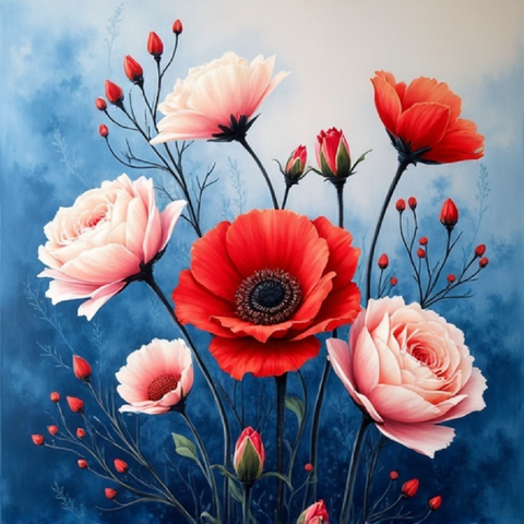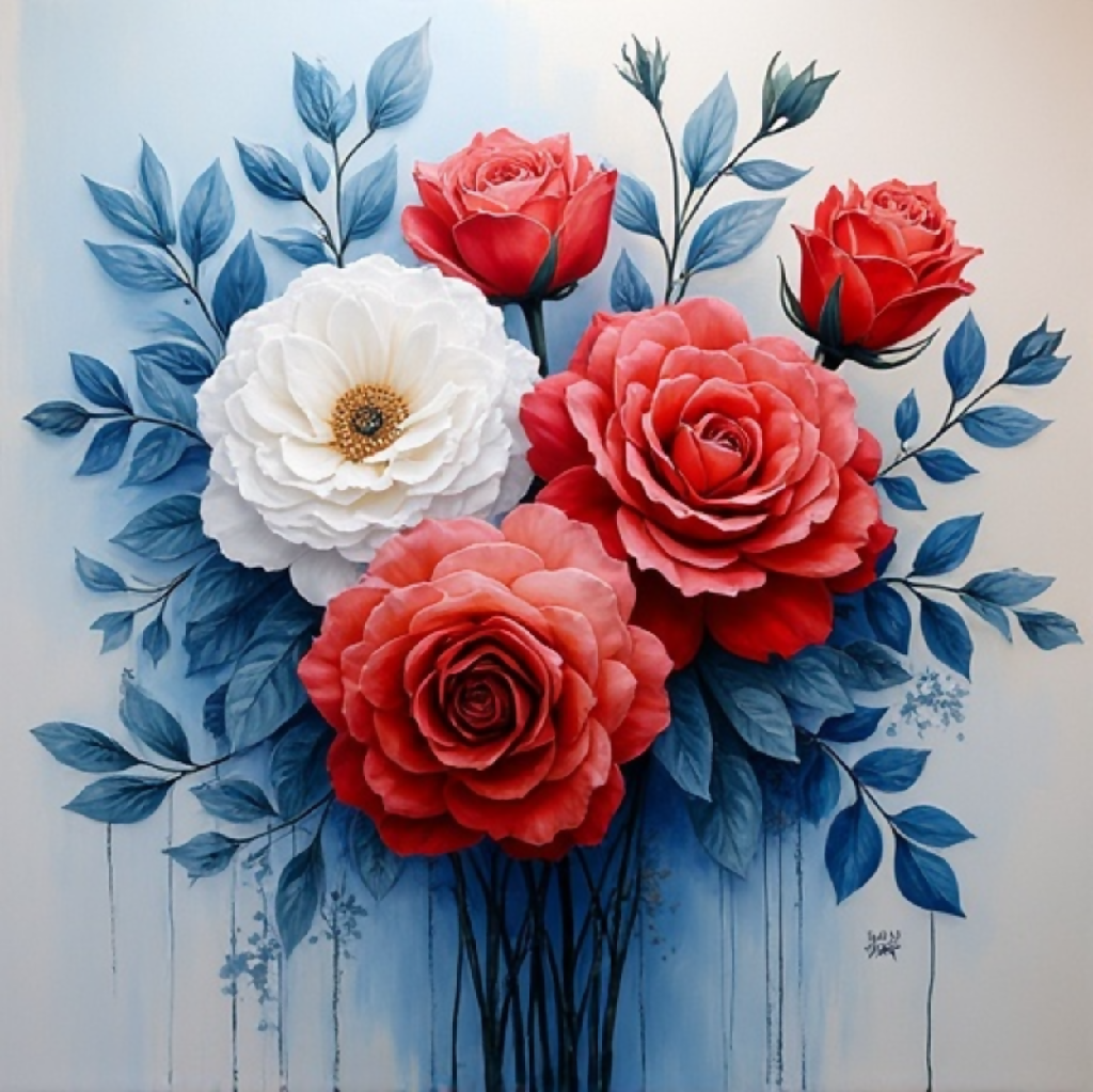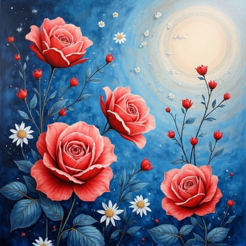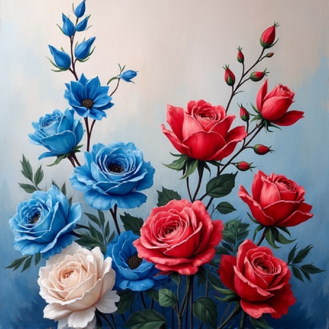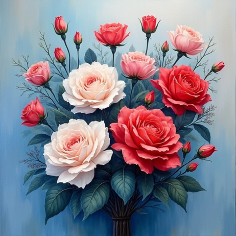 A beautifully hand-painted floral artwork featuring vibrant pink and red roses in full bloom, set against a dreamy gradient blue background. The composition includes blooming flowers, rosebuds, and lush, deep blue-green leaves, creating a vivid contrast and a sense of delicate elegance. The style blends realism with artistic flair, evoking a calm and romantic mood.
