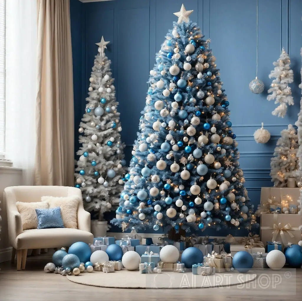 A blue Christmas tree in a festive environment with festive decoration, nursery, lively, tree has exactly 30 white large plain balls hanging off it, beautiful, the whole tree is centred in the photo, blue lights are warm and calming, happy nursery, toys and teaching, the background is a plain beige wall