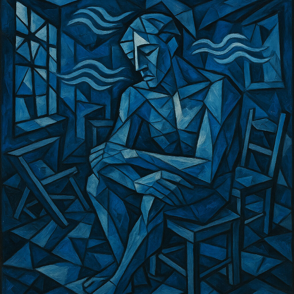 “Blue Echoes in a Broken Room” is a deeply expressive AI-generated artwork that draws inspiration from Picasso’s Blue Period and Cubist style. This emotionally charged piece features a fragmented human figure seated in a shattered, surreal interior, surrounded by jagged shapes and broken furniture—all rendered in moody shades of blue.