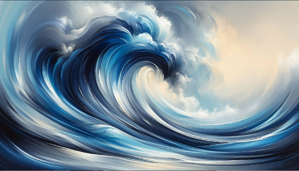 A captivating abstract painting featuring a dynamic blue and gray wave. The wave is depicted with fluid, sweeping brushstrokes that convey a sense of movement and energy.