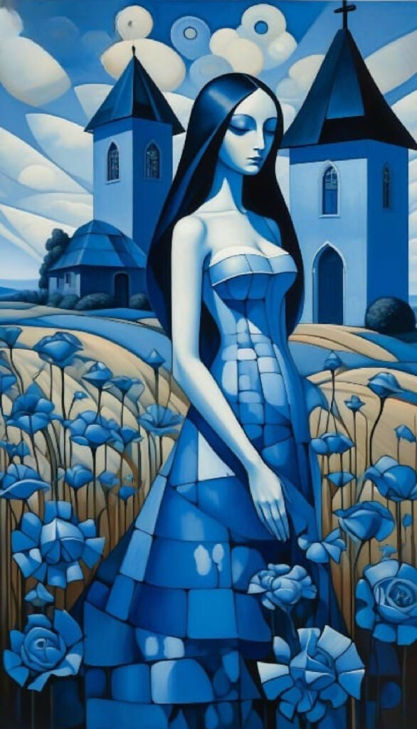 The image is a stylized, surreal painting predominantly in shades of blue. It features a tall, slender figure of a woman with long, dark hair, wearing a dress composed of geometric blue tiles. The background includes two church-like buildings with pointed roofs and a smaller house with a rounded roof. The sky is filled with abstract, circular cloud formations. The foreground is filled with large, blue flowers, possibly roses, adding to the surreal and dreamlike quality of the scene. The overall composition and color scheme create a striking and visually captivating image.