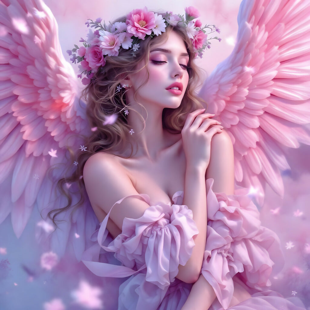 “Blush of Heaven” is a tender, dreamlike portrait of a heavenly being cloaked in soft pink hues and gentle grace. With delicate wings, a flowing off-shoulder gown, and a floral crown woven from roses and daisies, she radiates innocence, romance, and celestial warmth. Her serene expression and rosy surroundings create a vision of beauty and divine stillness.