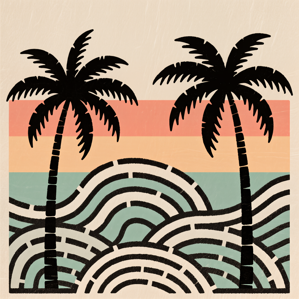 This chic 1:1 vector artwork fuses beachy vibes with modern-retro design. Featuring thick-lined wave arches, twin palms, and a soft vintage sunset, it creates the perfect boho statement piece for homes, studios, or apparel prints.