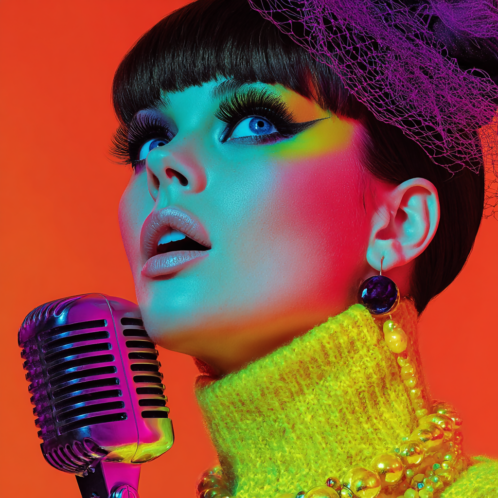 Tags: 60s pop singer, beehive hairstyle, neon fashion, vintage microphone, retro accessories, bold colors