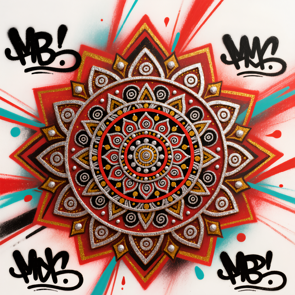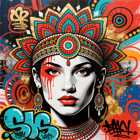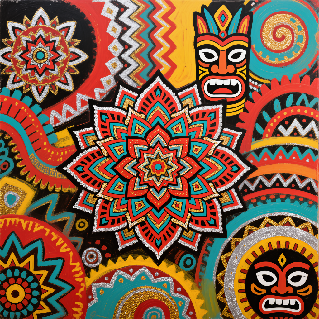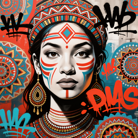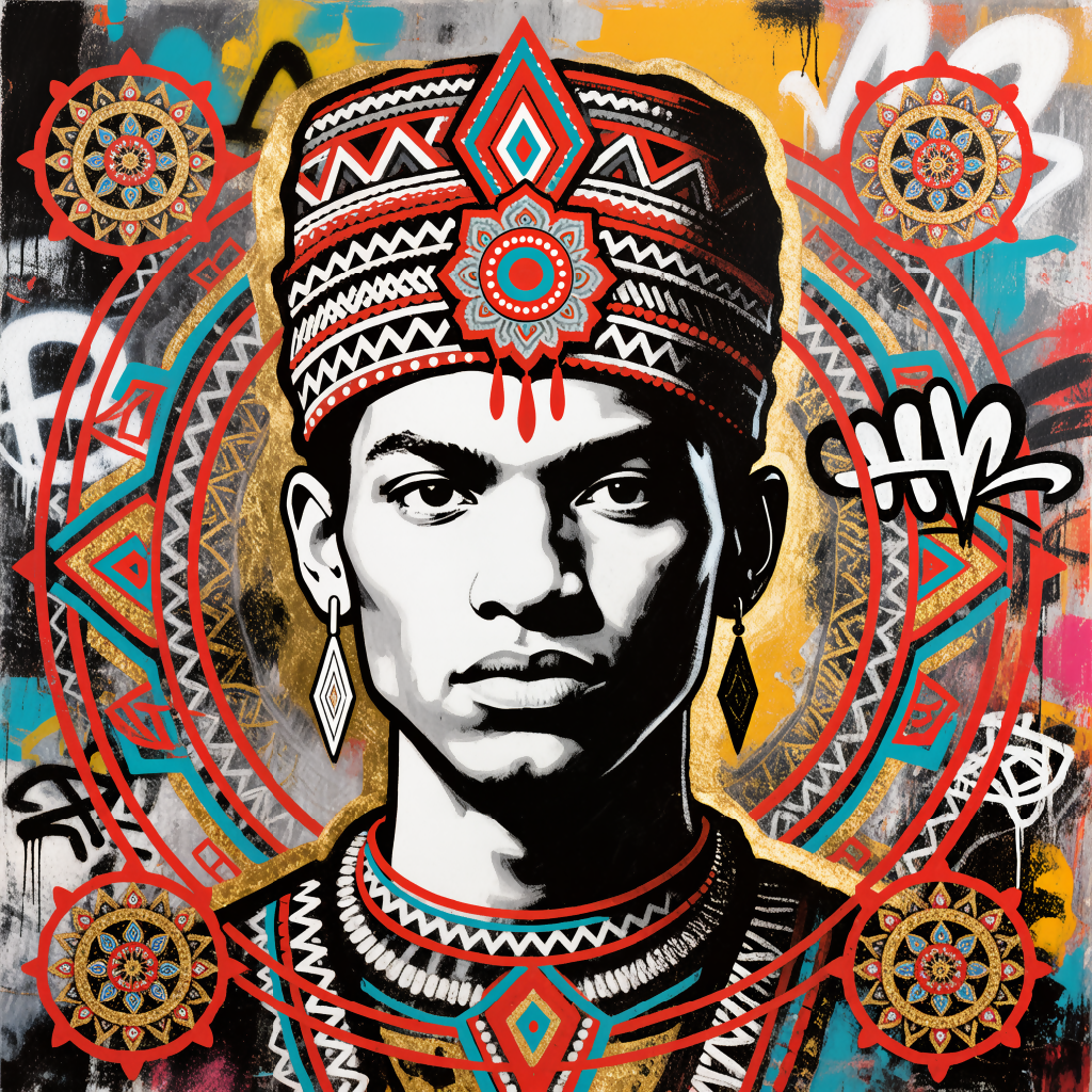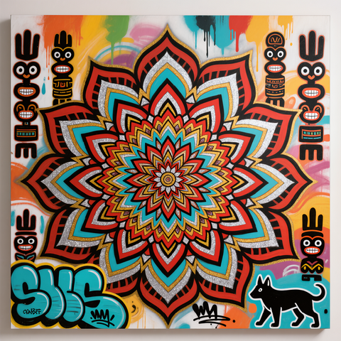 “A vibrant wall art piece blending tribal motifs, mandala patterns, and graffiti-inspired street art in bold reds, turquoise, and metallic accents for a striking cultural fusion.”