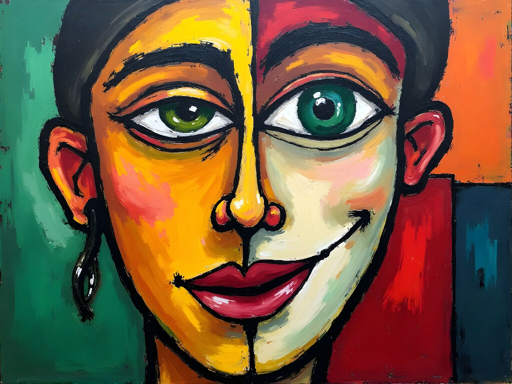 This vibrant, abstract AI digital painting showcases a striking Expressionist-style woman’s face split vertically into two contrasting halves. The left side glows in warm yellow tones with a vivid green eye, while the right side features bold reds and a piercing blue eye. Her red lips and dark, stylized hair add to the dramatic intensity. The textured background blends green and orange hues, creating a dynamic and emotional contrast. Rich in color and texture, this artwork captures powerful feelings through bold brushstrokes and a contemporary abstract aesthetic, perfect for collectors of expressive AI-generated and modern digital art.