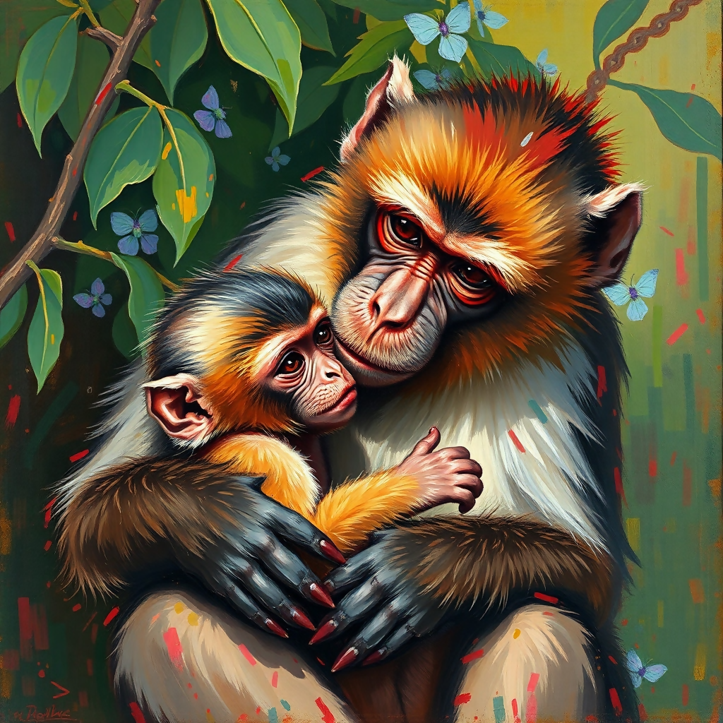 This heartwarming image captures a tender moment between a mother macaque and her baby in their natural habitat. The gentle gaze shared between them speaks volumes of love, care, and trust. Nestled close to her chest, the tiny baby clings to its mother with delicate fingers, while she cradles it protectively amidst lush greenery. The soft light filtering through the foliage highlights the intricate details of their fur, creating a serene portrait of connection and nurturing that transcends species.