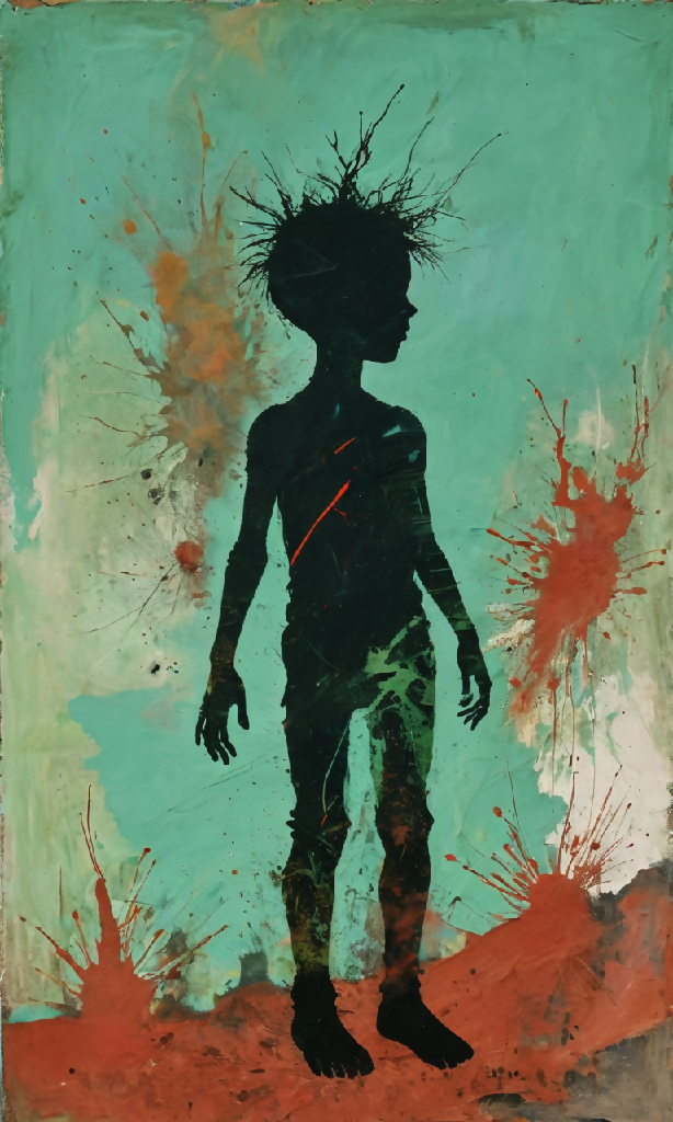 There’s a timeless quality to this image, yet it also feels incredibly modern. It reminds me of the silhouette art from Kara Walker, but with an abstract and painterly twist that feels deeply personal. The roughness of the textures and the deliberate imperfections lend it an emotional depth, as if the piece is asking us to consider the complexity of growth, identity, and resilience. It’s a stunning exploration of contrasts—stillness and chaos, childhood and the weight of existence.