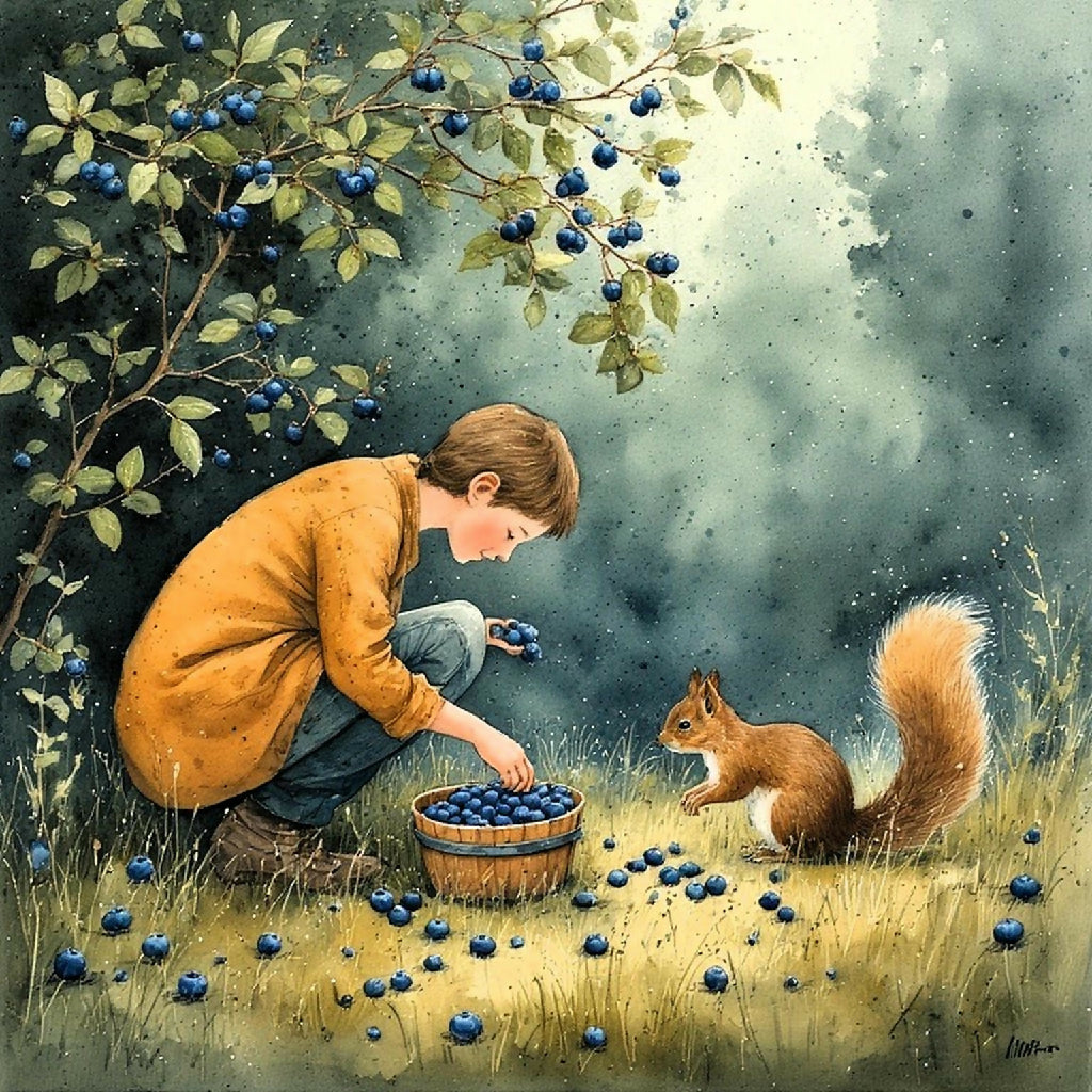 This Ai watercolor illustration depicts a peaceful scene of a child harvesting blueberries. A young boy, crouches down to carefully pick ripe blueberries from a lush bush, placing them into a wooden bucket. Beside him, a curious squirrel with a bushy tail observes the activity, creating a heartwarming moment of shared nature.