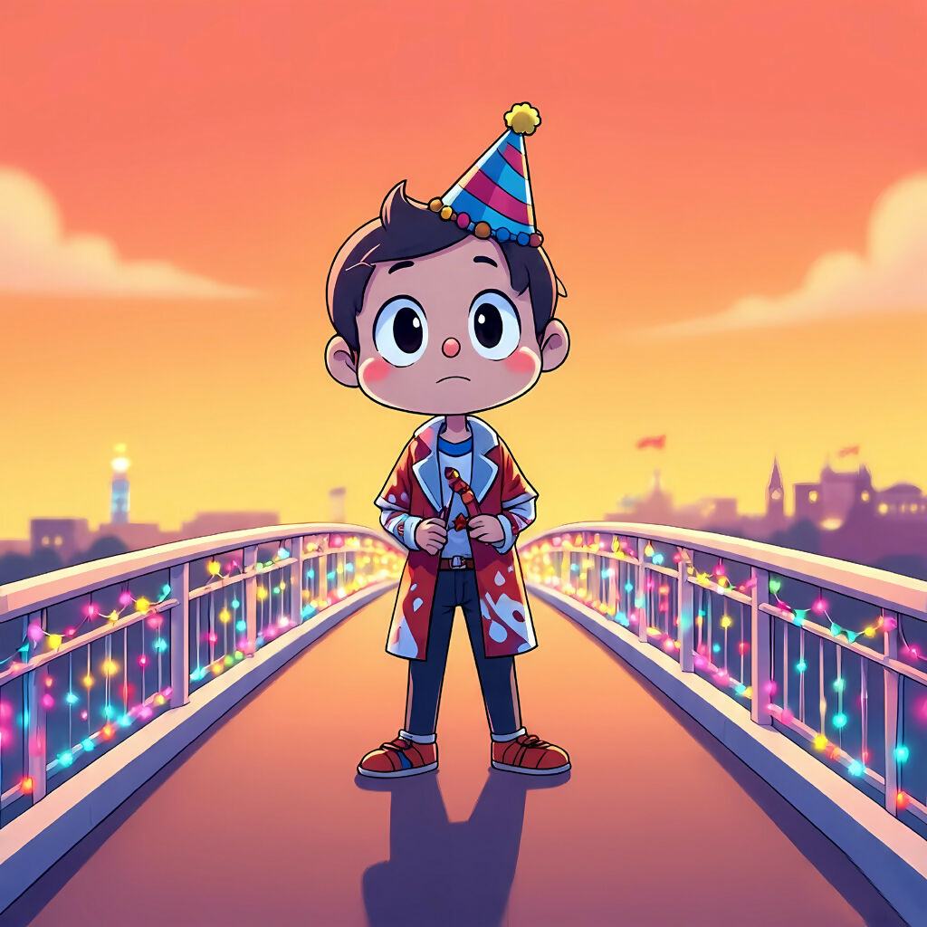 This vibrant illustration portrays a young boy standing on a bridge adorned with glowing string lights, wearing a playful party hat and holding a party blower. Behind him, the sky glows in warm sunset hues, with a distant cityscape adding depth and atmosphere. The contrast between the celebratory decorations and the boy’s contemplative expression creates a captivating narrative — a moment of quiet reflection amid festivity. This artwork beautifully captures the emotional duality of joy and introspection, inviting viewers to connect with the universal experience of celebration tinged with thoughtfulness.