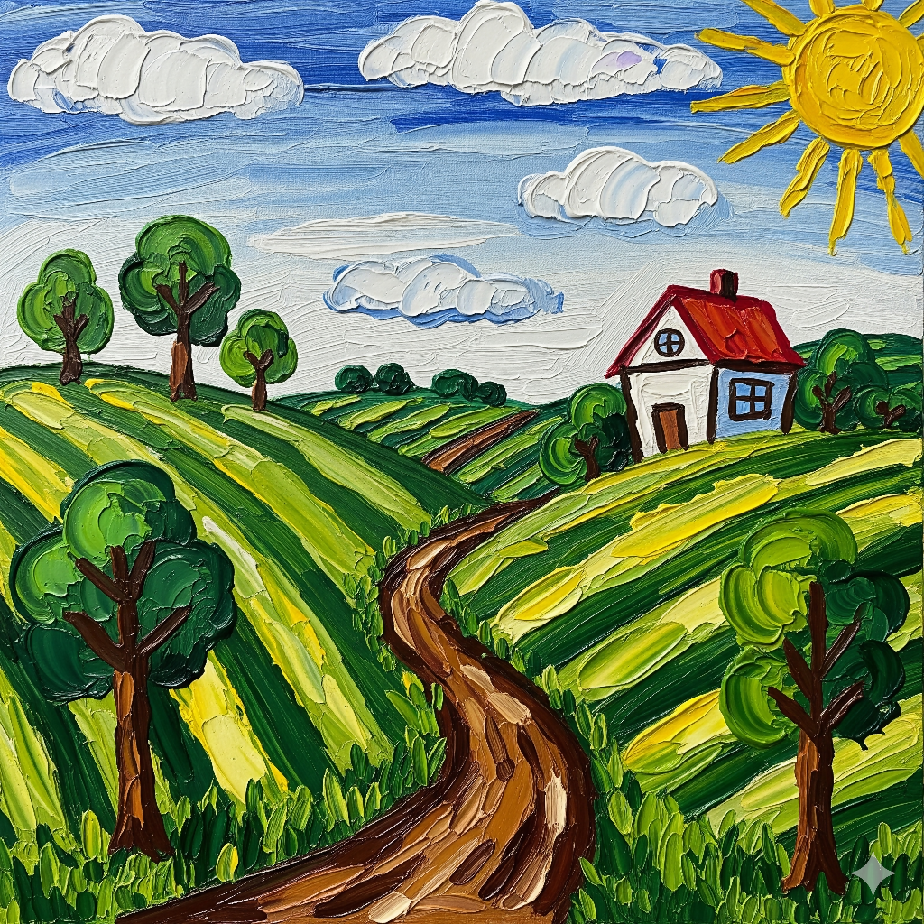 This cheerful oil painting depicts a beautiful rural scene. A winding path leads to a small, red-roofed house, surrounded by green trees and yellow-green striped hills. The bright blue sky, with shining sun and white clouds, creates a warm and peaceful atmosphere. Perfect for decorating a living room, cafe, office, or workspace, it creates a natural, fresh, and cheerful feel.