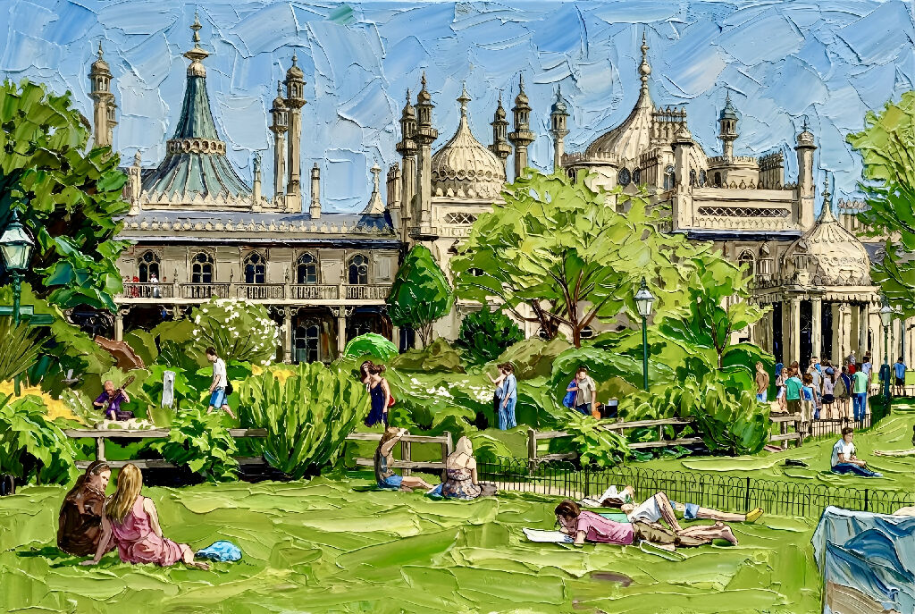 This vibrant oil painting captures the iconic Brighton Royal Pavilion Garden, blending architectural grandeur with the casual ease of a summer afternoon. The thick, impasto brushstrokes bring the lush greenery to life, creating a tactile sense of depth across the sprawling lawn where visitors lounge and connect.
