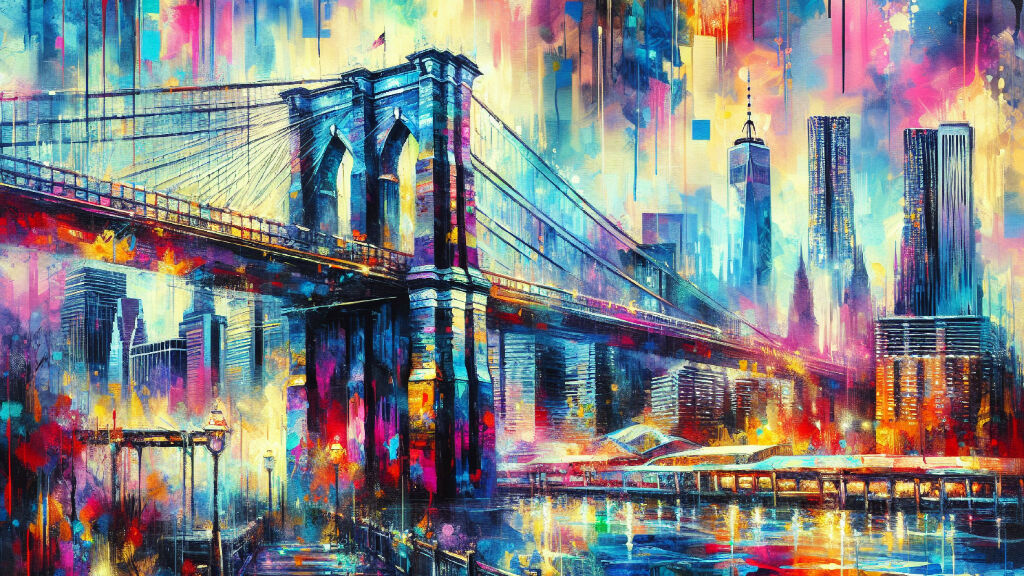 A stunning and colorful representation of a bustling urban street featuring iconic architecture of the brooklyn bridge, and glowing city lights of newyork. This high-quality art print captures the vibrancy and energy of city life, making it a perfect addition to any modern living space or office.