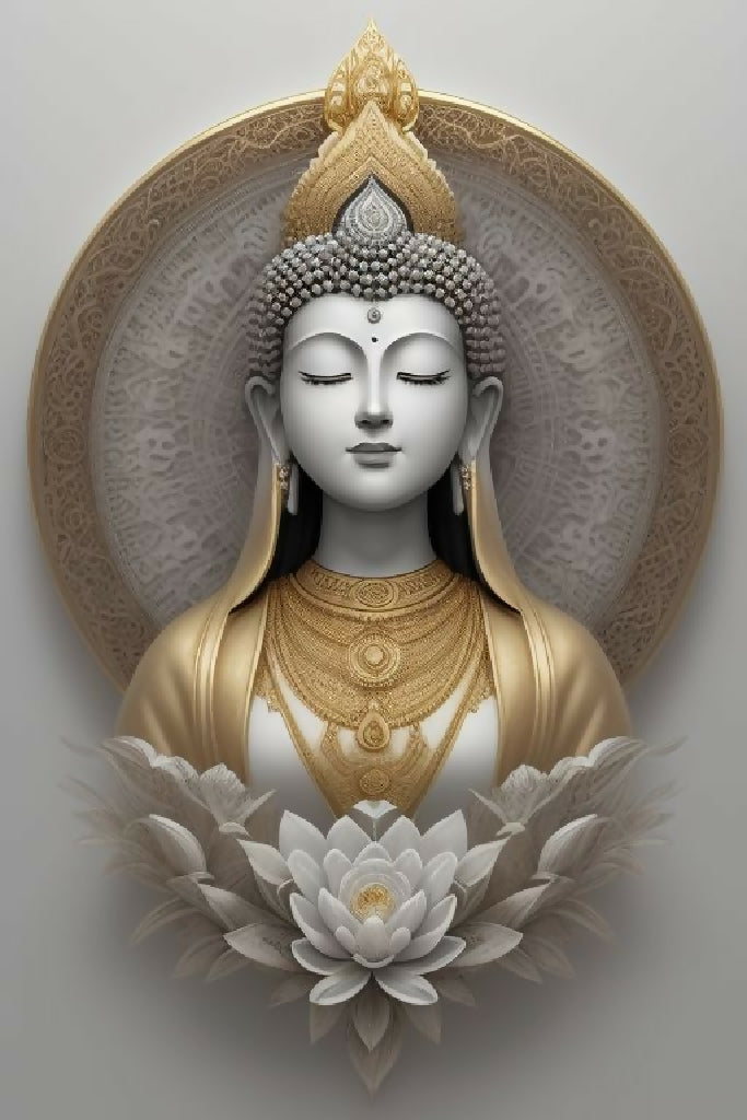 The lower part of the image features beautifully rendered lotus flowers in shades of white and soft gold, symbolising purity, enlightenment, and rebirth. The soft monochrome background contrasts beautifully with the golden accents, giving the entire image a refined, sacred, and harmonious appearance.