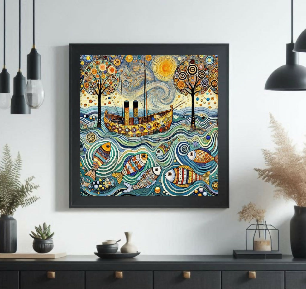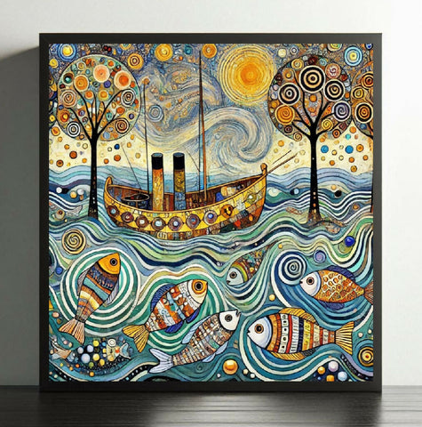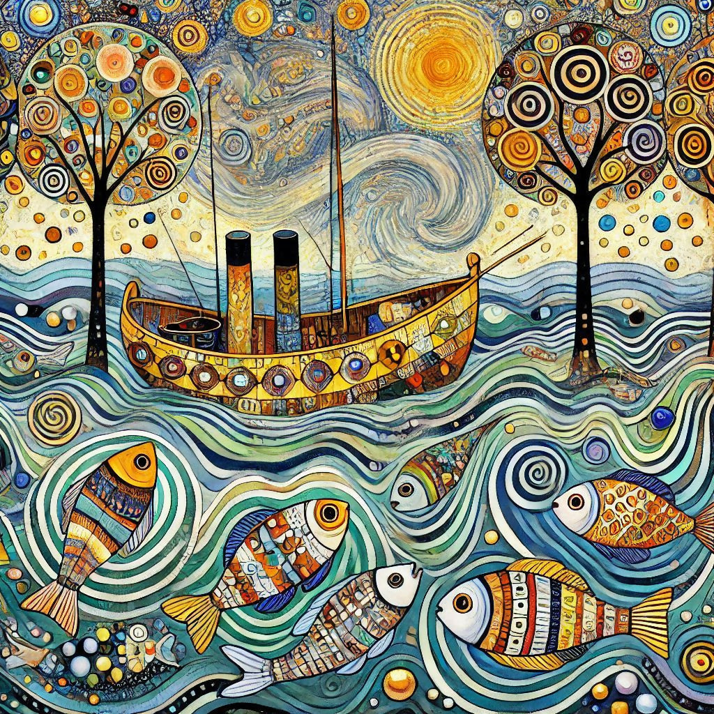 Ein farbenfrohes, fantasievolles Gemälde eines Schiffs, das auf einem stilisierten Ozean segelt. Das Schiff ist gelb und mit komplizierten Mustern verziert. Das Wasser wird durch eine Reihe von Wellenlinien dargestellt, die mit bunten, gemusterten Fischen bevölkert sind. An beiden Seiten des Schiffs stehen zwei Bäume mit kreisförmigen Blättern, und oben am Himmel gibt es eine Sonne. Der Gesamtstil des Gemäldes ist verspielt und träumerisch.