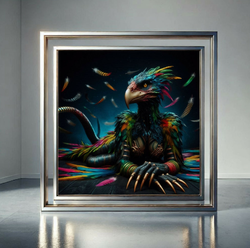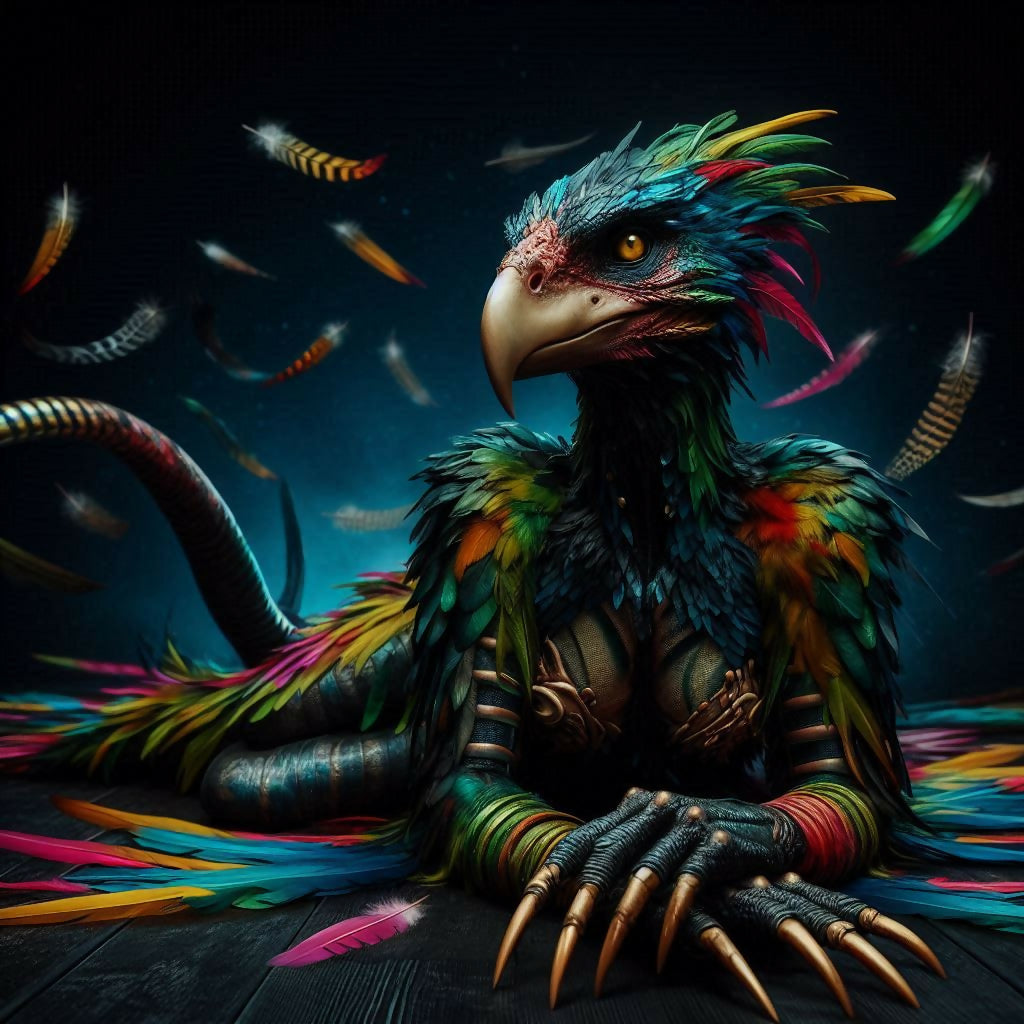 Das Bild zeigt eine fantasievolle Kreatur, die Elemente von Vogel, Reptil und Mensch verbindet. Sie liegt auf dem Boden, umgeben von vielen bunten Federn. Ihr Körper ist überwiegend dunkel, aber mit leuchtenden, farbenfrohen Federn bedeckt. Sie hat einen Adlerkopf, einen Schlangen- oder Echsenkörper und menschliche Arme und Hände mit goldenen Armbändern. Das Bild wirkt fantasievoll und detailreich.